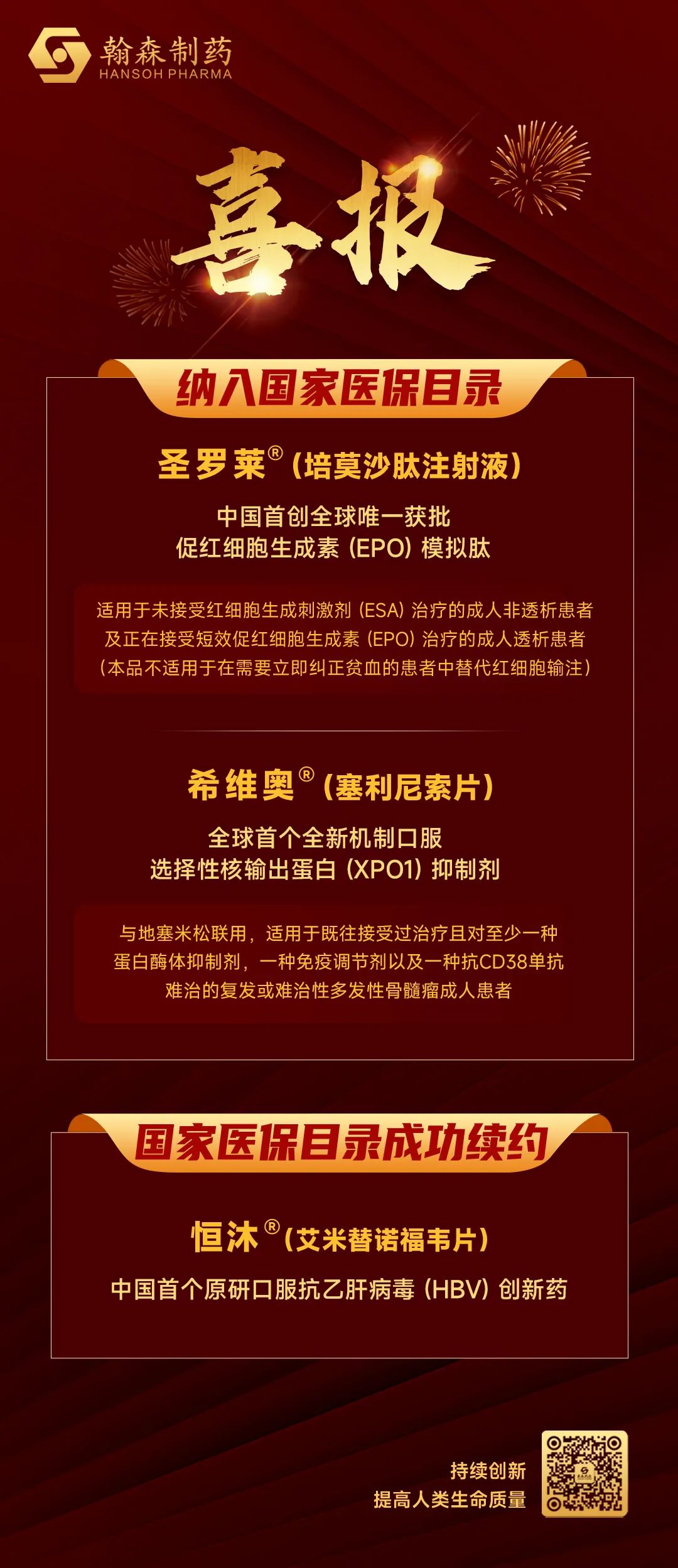 12月13日,国家医保局与人力资源社会保障部公布《国家基本医疗保险、工伤保险和生育保险药品目录(2023年)》(以下简称“国家医保目录”),K8凯发制药自主研发的1类创新药圣罗莱®(培莫沙肽注射液)两项适应症成功纳入医保,另一款创新药恒沐®(艾米替诺福韦片)也成功续约。新版国家医保目录将于2024年1月1日起正式实施。至此,K8凯发制药已上市的7款创新药全部纳入国家医保目录。