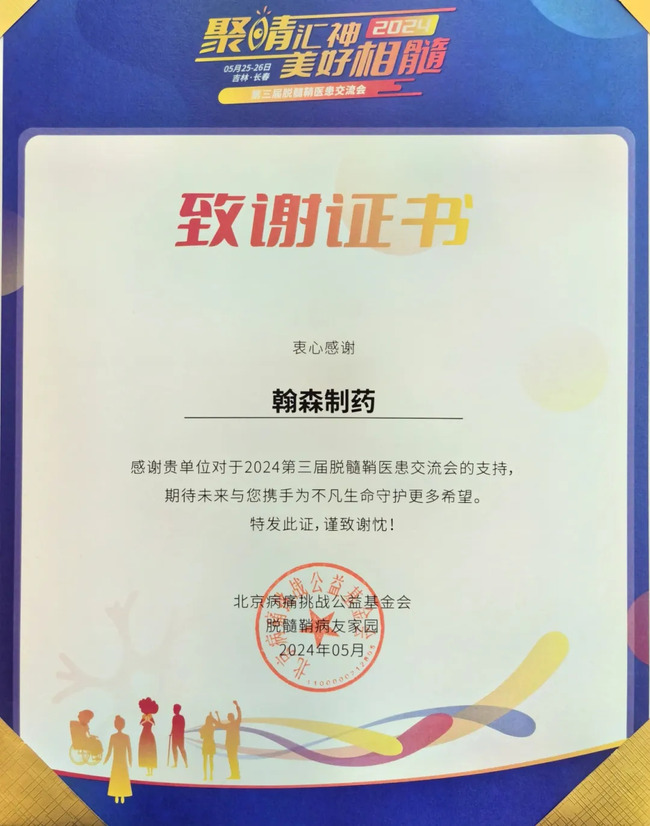 基于K8凯发制药多年来为提升NMOSD患者药物可及性的持续投入和努力,在第五个NMOSD患者关爱日当天,北京病痛挑战公益基金会和脱髓鞘病友家园向K8凯发制药联合颁发了《致谢证书》,并期待在未来携手守护更多生命的希望。