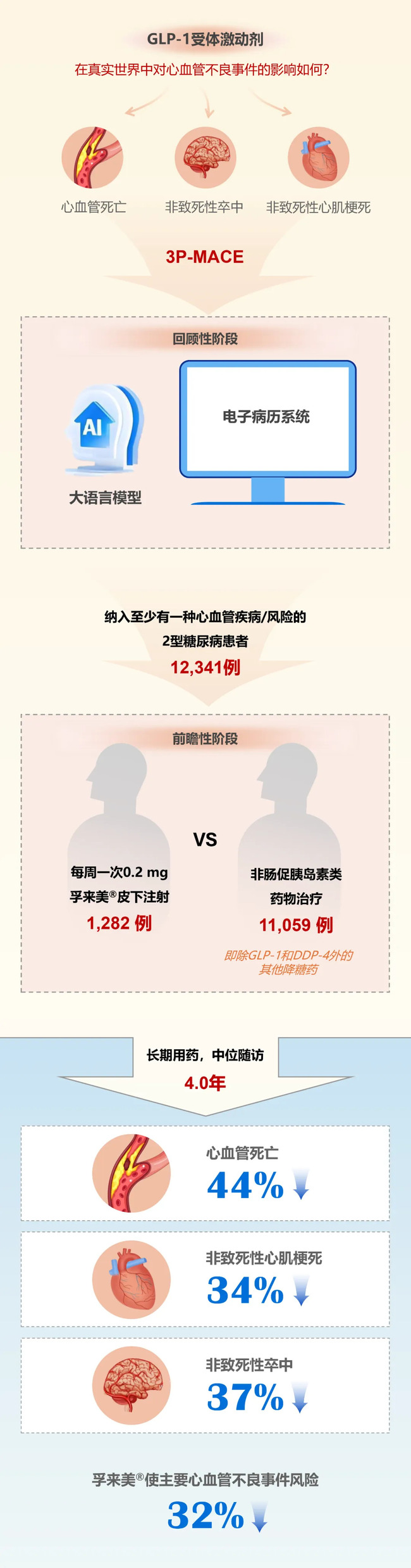 研究比较了孚来美®(治疗组)和接受非肠促胰岛素类降糖药治疗(对照组)在长期随访4年后的心血管不良事件发生率。