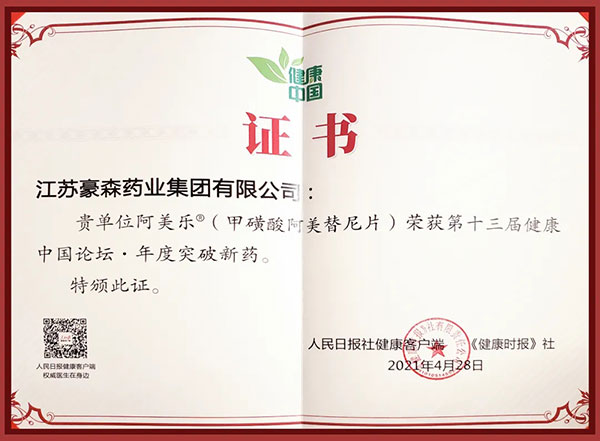 4月28日,人民日报社健康客户端和《健康时报》社颁布了“第十三届健康中国论坛·年度突破新药”等系列榜单荣誉。江苏豪森药业集团有限公司(以下简称“豪森药业”)自主研发的首个中国原创三代EGFR-TKI创新药阿美乐®(甲磺酸阿美替尼片)荣膺上榜。