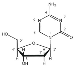 【成份】 | 本品主要成份为地西他滨。 化学名称:4-氨基-1-(2-脱氧-β-D-赤式-呋喃核糖)-1,3,5-三嗪-2(1H)-酮 化学结构式: 分子量:228.21 辅料:磷酸二氢钾、氢氧化钠。 |