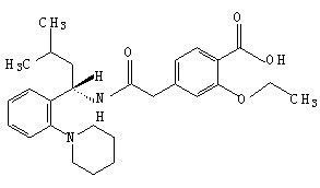 【成份】 | 本品主要成份为瑞格列奈。 化学名称:(S)-2-乙氧基-4-[2-[[甲基-1-[2-(1-哌啶基)苯基]丁基]氨基]-2-氧代乙基]苯甲酸。 化学结构式: 分子量:452.59 |