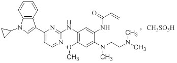 【成份】 | 本品主要成份为甲磺酸阿美替尼。 化学名称:N-(5-((4-(1-环丙基-1H-吲哚-3-基)嘧啶-2-基)氨基)-2-((2-(二甲氨基)乙基)(甲基)氨基)-4-甲氧苯基)丙烯酰胺甲磺酸盐 化学结构式: 分子式:C30H35N7O2·CH4SO3 分子量:621.75 |