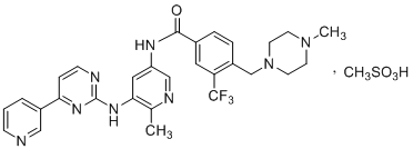 【成份】 | 本品主要成份为甲磺酸氟马替尼。 化学名称:N-[6-甲基-5-[[4-(吡啶-3-基)嘧啶-2-基]氨基]吡啶-3-基]-4-[(4-甲基哌嗪-1-基)甲基]-3-(三氟甲基)苯甲酰胺甲磺酸盐 化学结构式: 分子量:658.69 |