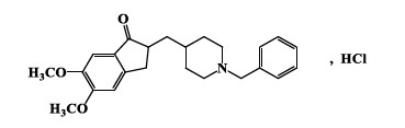 【成份】 | 本品主要成份为盐酸多奈哌齐。 化学名称:(±)-2-[(1-苄基-4-哌啶基)甲基]-5,6-二甲氧基-1-茚酮盐酸盐 化学结构式: 分子量:415.96 |